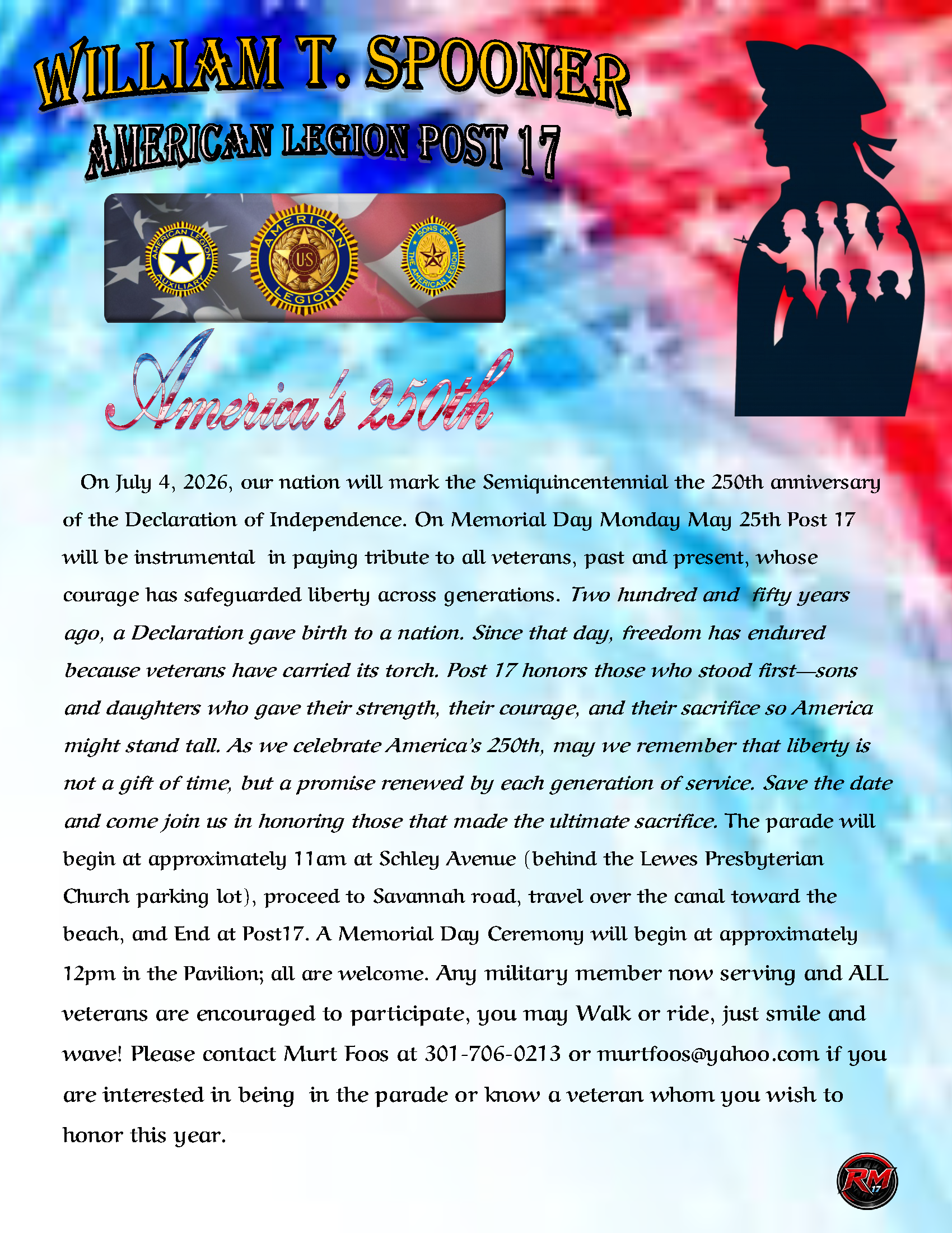 Join the community in honoring the service and sacrifice of veterans during this special Memorial Day tribute hosted by William T. Spooner American Legion Post 17. As part of the lead-up to America’s 250th anniversary, this event recognizes the generations of men and women whose courage has safeguarded liberty and carried the promise of freedom forward.